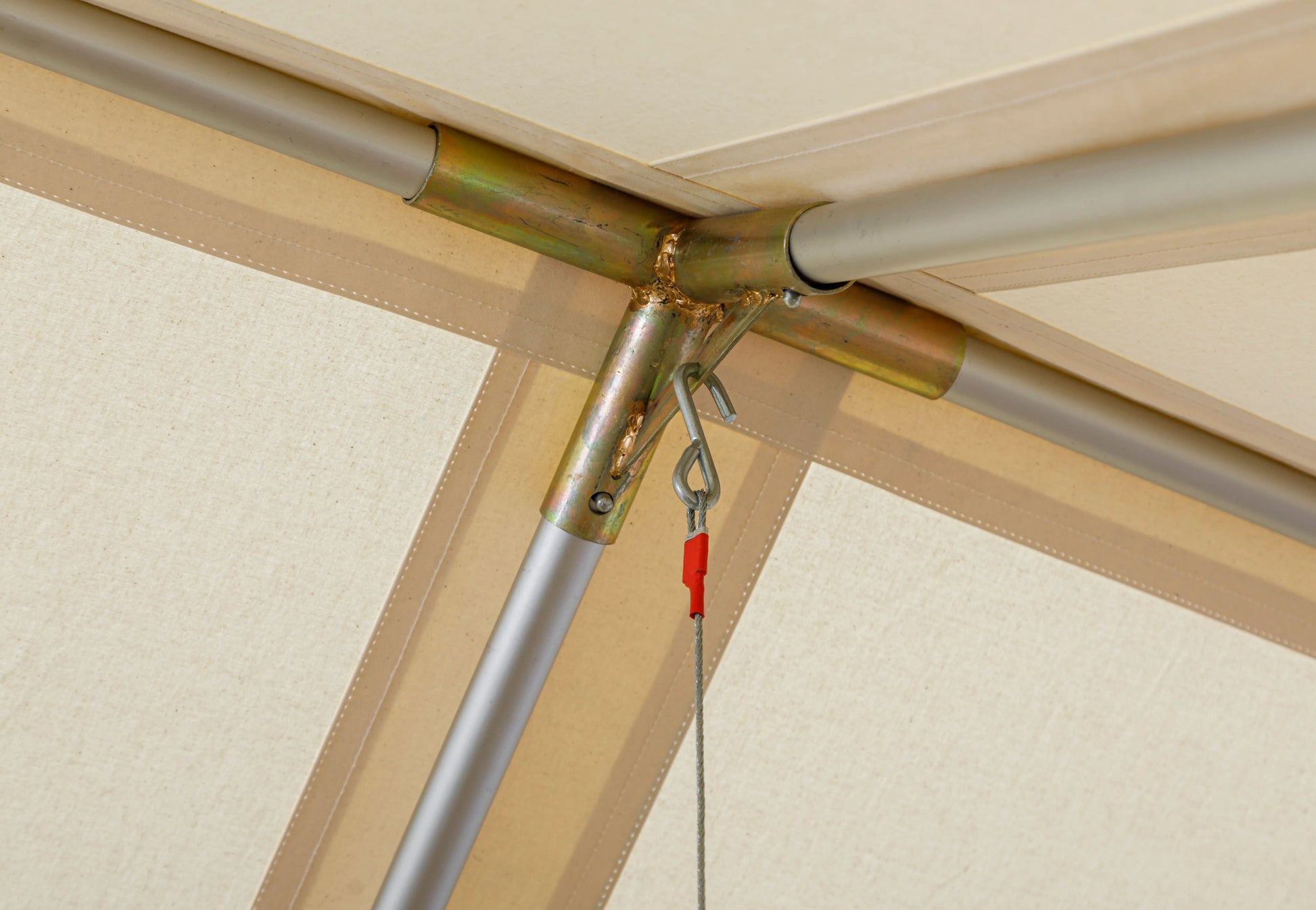Voor een lange levensduur is het belangrijk dat de canvas tent volledig droog wordt opgeborgen. Reinig het doek met lauw water en vermijd agressieve reinigingsmiddelen om de beschermende coating te behouden.