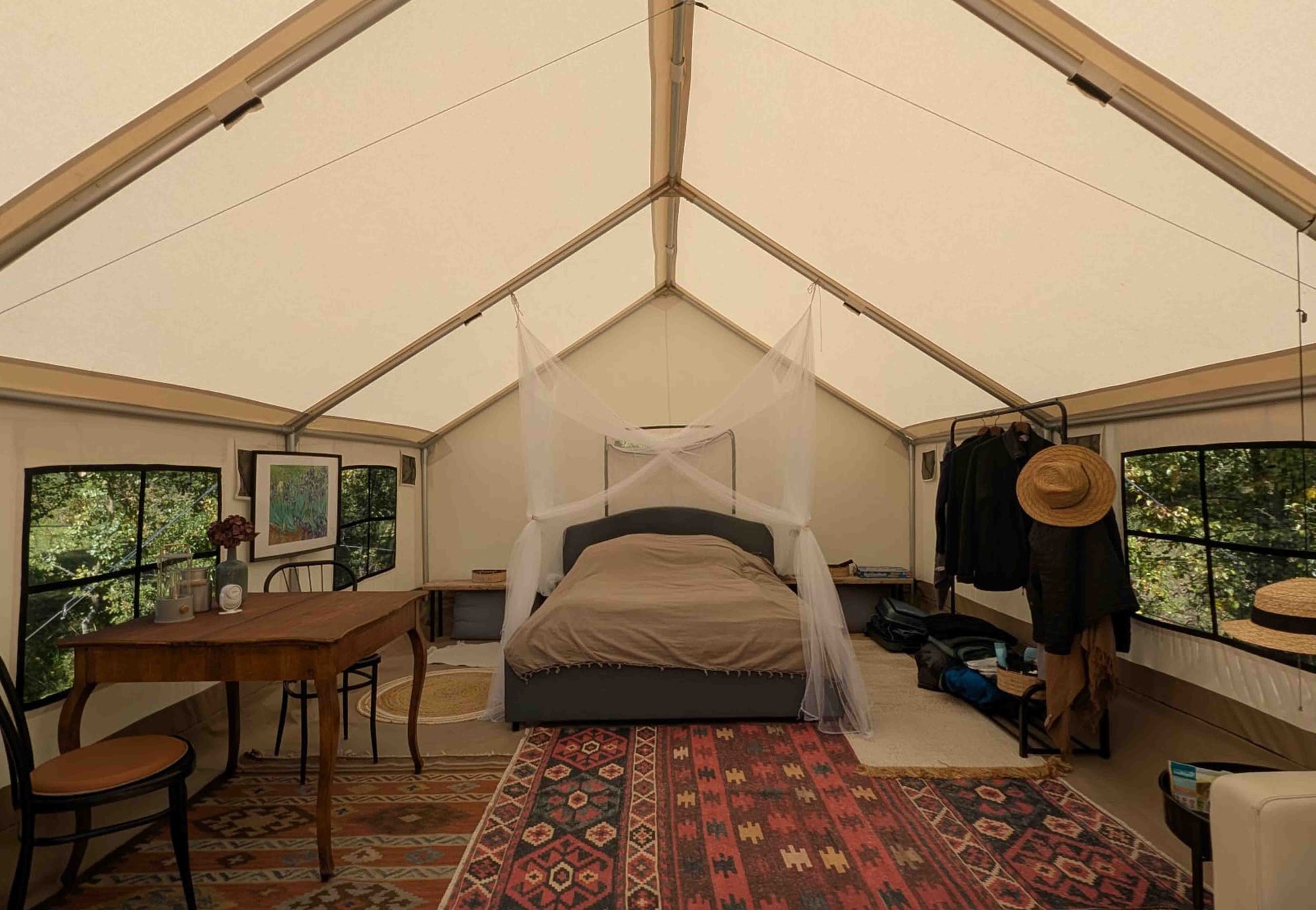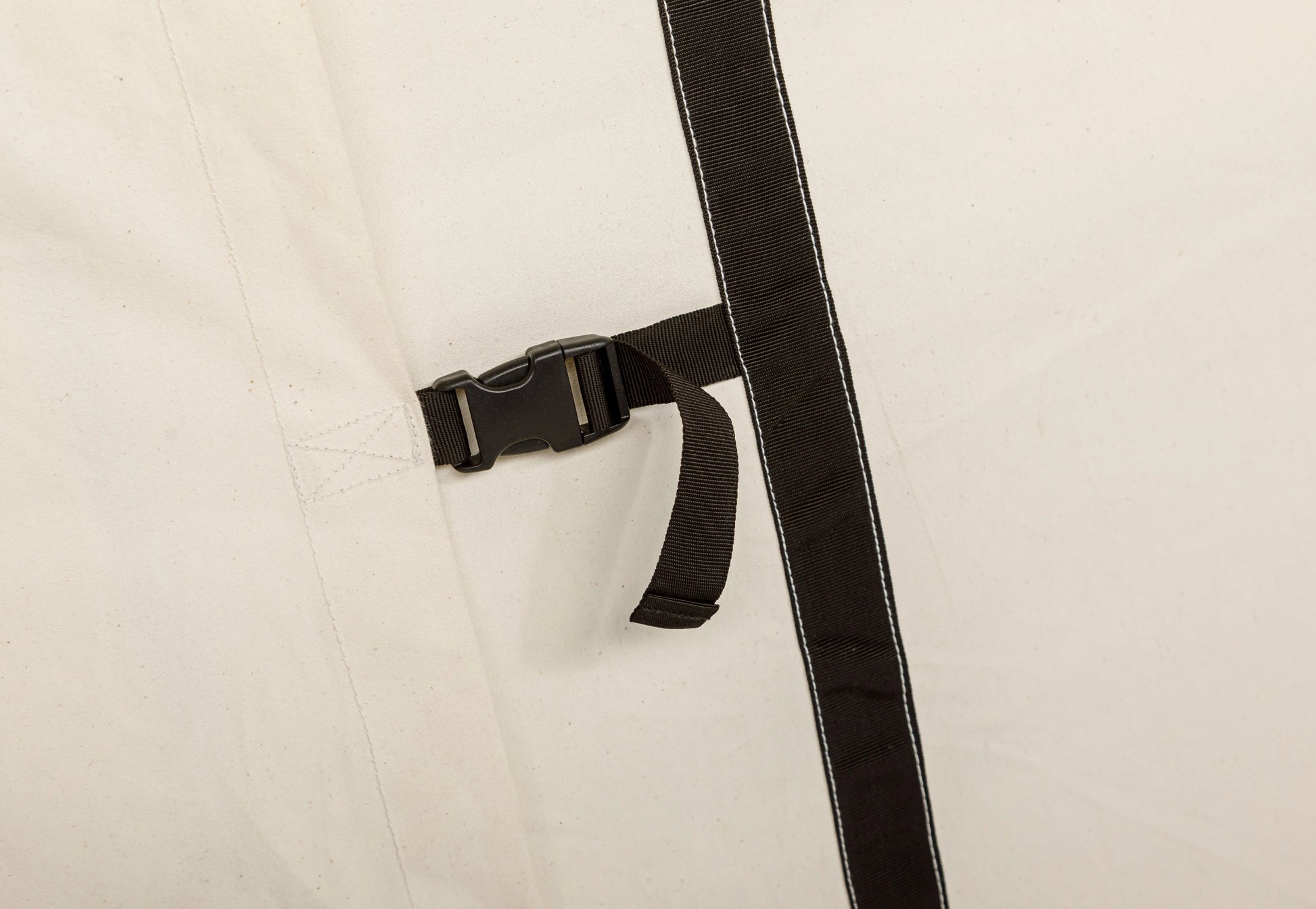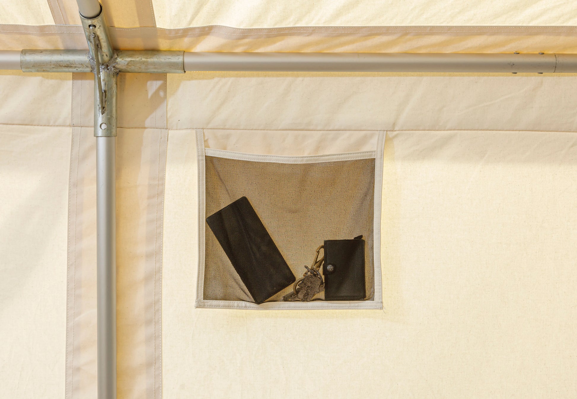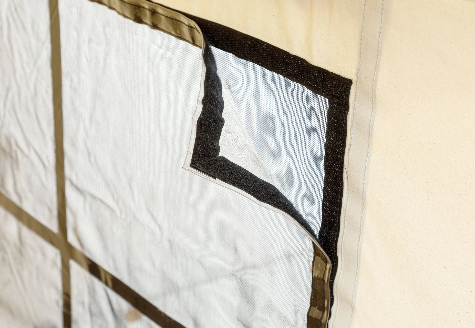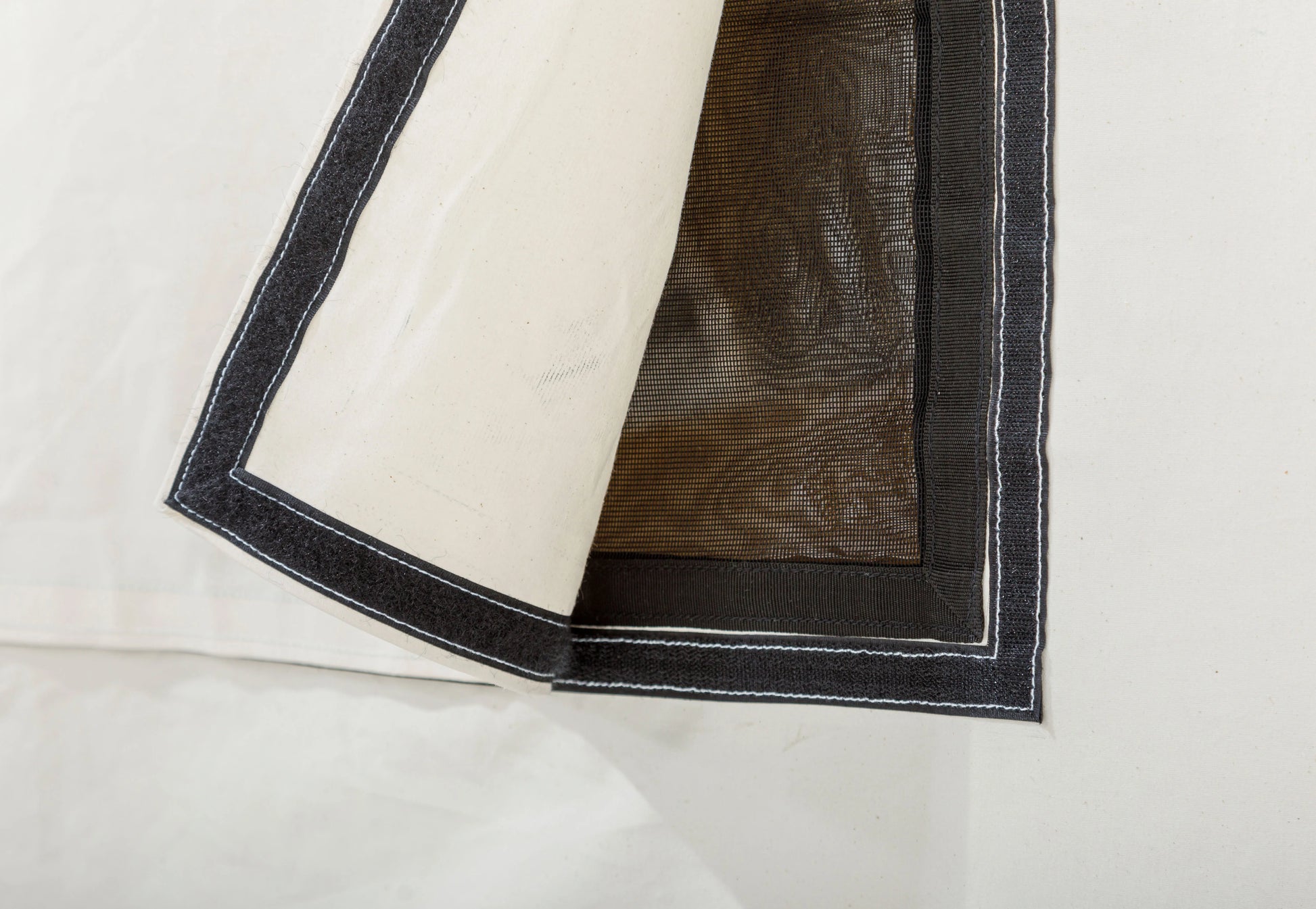 De versterkte PVC-basis met modderflappen helpt om de tent schoon en droog te houden. De badkuip-stijl vloer beperkt het risico op waterinfiltratie, ook op oneffen of nat terrein. Daardoor is de CanvasCamp Safari Tent bijzonder geschikt voor locaties waar duurzaamheid, comfort en betrouwbaarheid centraal staan. Grote gaasramen met PVC-afdekkingen zorgen voor een aangename ventilatie tijdens warm weer en kunnen volledig worden afgesloten bij regen of wind.