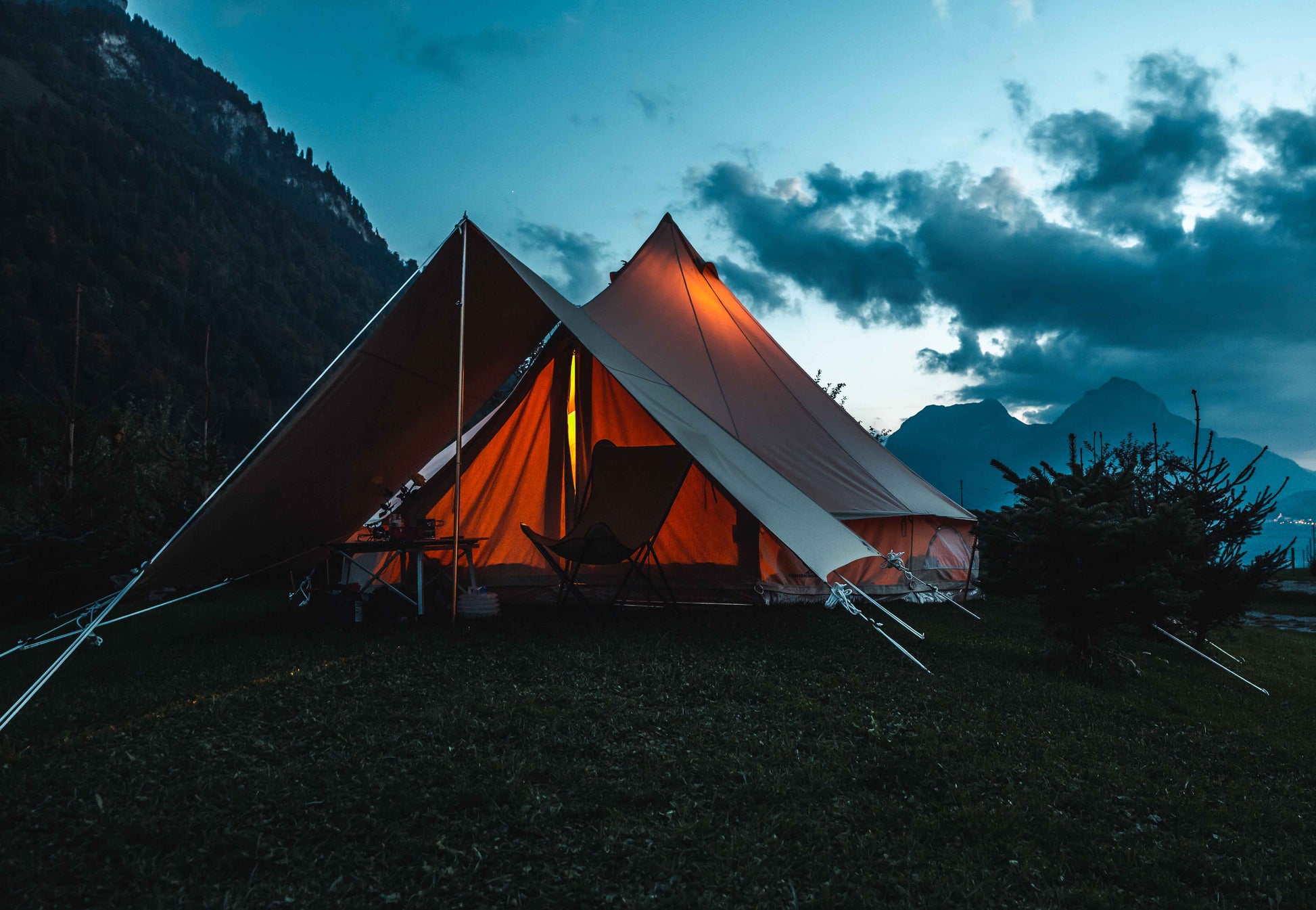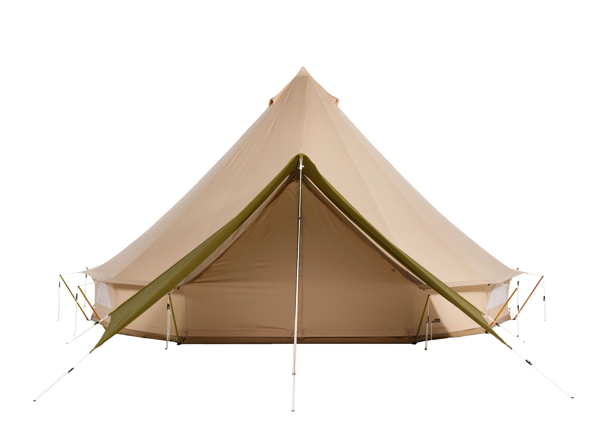 Als verbinder koppelt hij twee Sibley Bell Tents tot één grotere leefruimte met een overdekte doorgang.